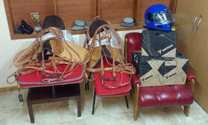 Se trata de dos monturas inglesas, con juego de estribos de hierro completo, matra lana, juegos de cabezada riendas y frenos, cincha piolín con camiones y pretales de suela destinado a la Sección Montada. Así también, se recibieron tres cascos protectores para la Sección Motorizada.