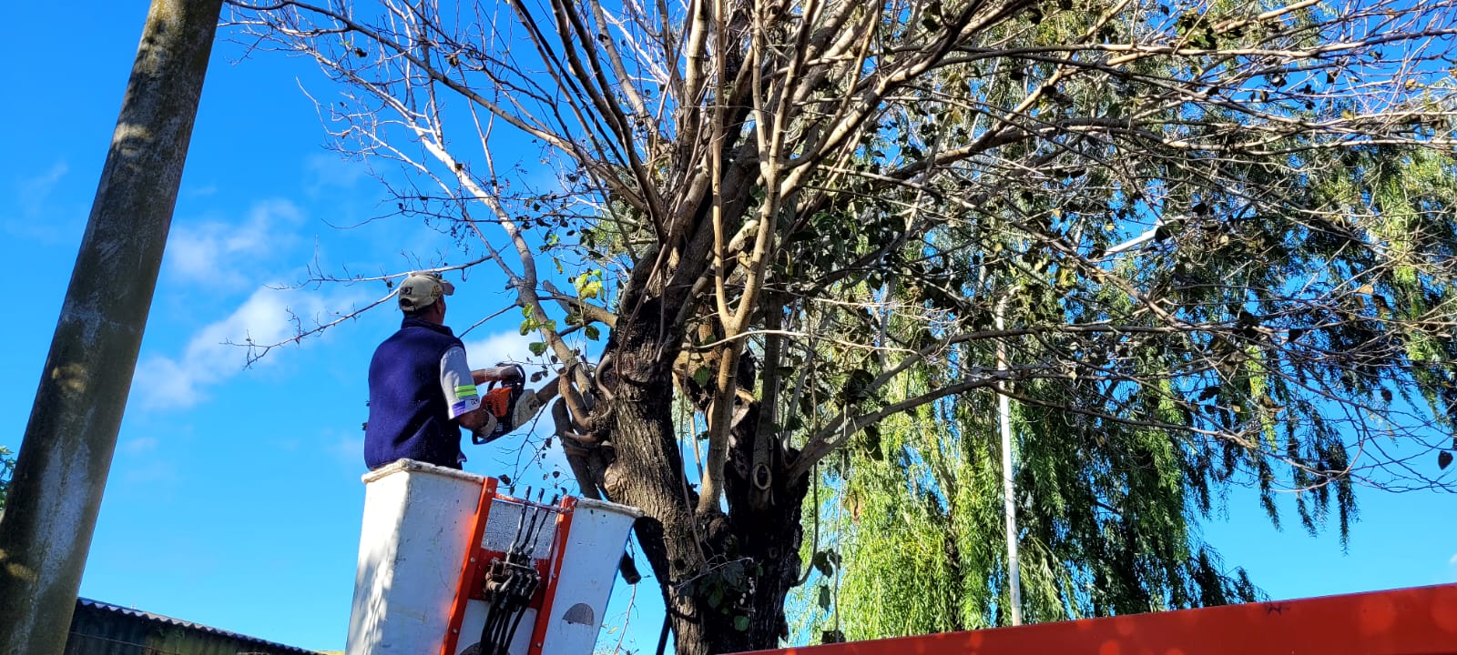 Por tal motivo, personal del Área de Espacios Verdes comenzó con las podas en el sector noroeste de la localidad, sobre calle 00, e irá avanzando, manzana por manzana, para trabajar sobre todo el arbolado público del pueblo (árboles en veredas, parques, plazas).