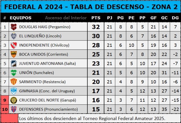 Boca Unidos y Unión de Sunchales igualaron en un tanto, mientras que Douglas Haig venció 2 a 0 a Crucero del Norte, victoria que le permite mantener la categoría al igual que El Linqueño con el punto conseguido en la igualdad en cero ante Independiente de Chivilcoy.