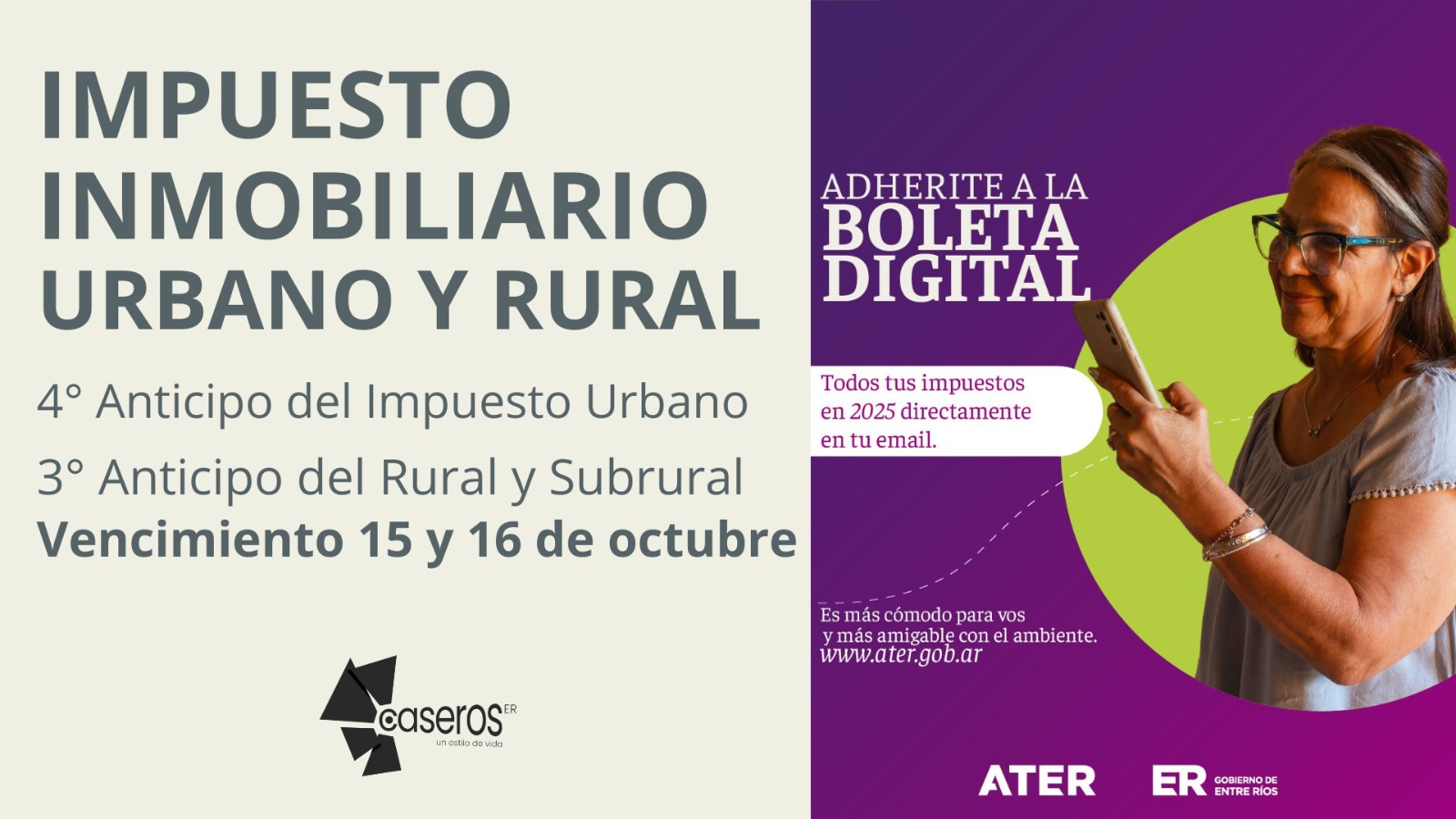 En la Caja del Entre Ríos Servicios se encuentran al cobro el 4° Anticipo del Impuesto Inmobiliario Urbano 2025 y el 3° Anticipo del Impuesto Inmobiliario Rural y Subrural.